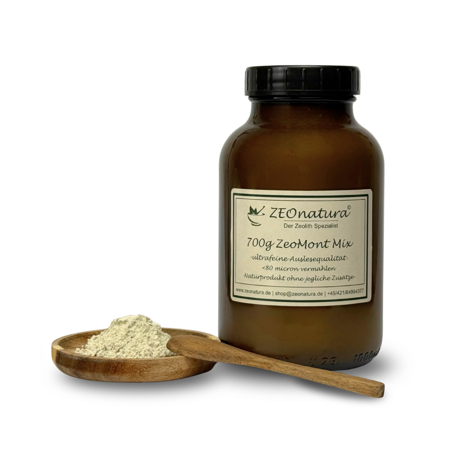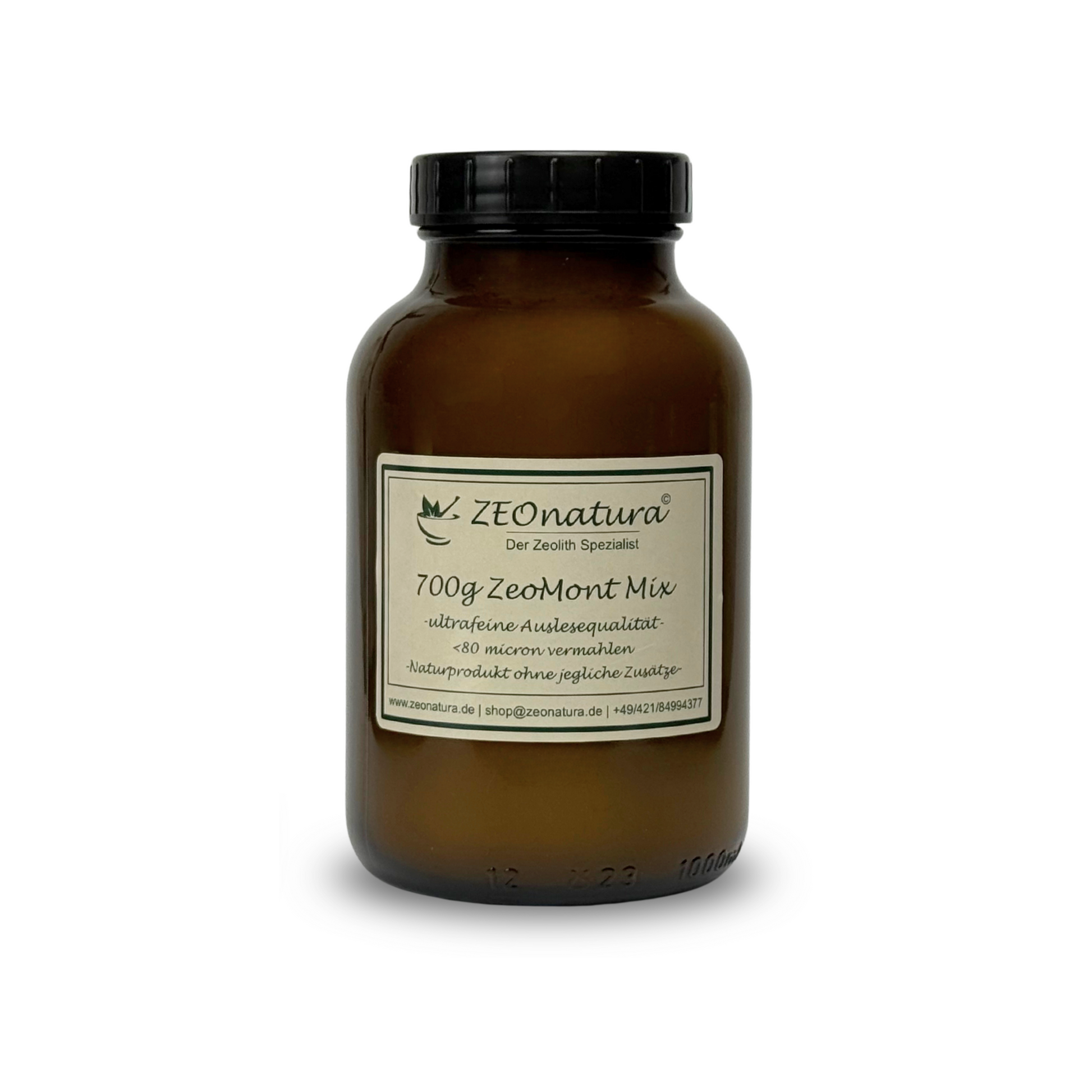 The popular 1000 ml large glass jar, filled with "ZeoMont", a mixture of exclusively zeolite clinoptilolite and bentonite (montmorillonite) in a ratio of 1:1.